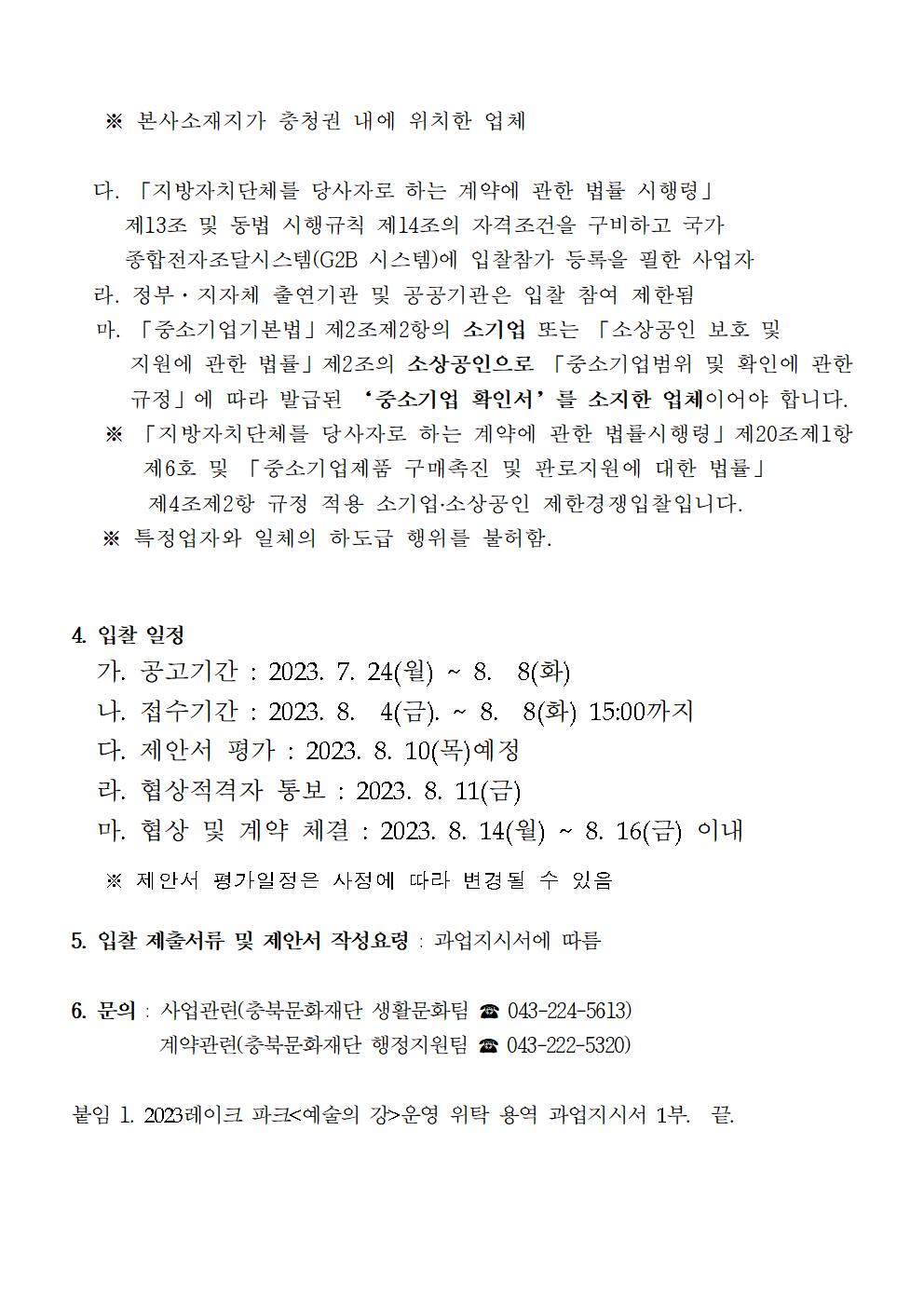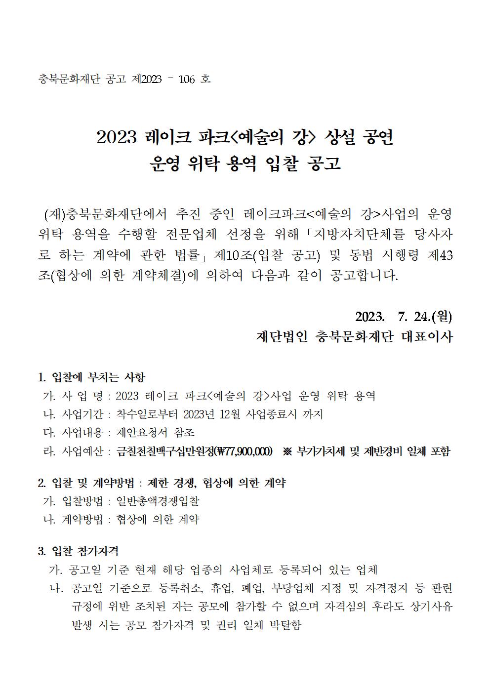 | 2023 레이크 파크<예술의 강>상설 공연 운영 위탁 용역입찰 공고 | |||||