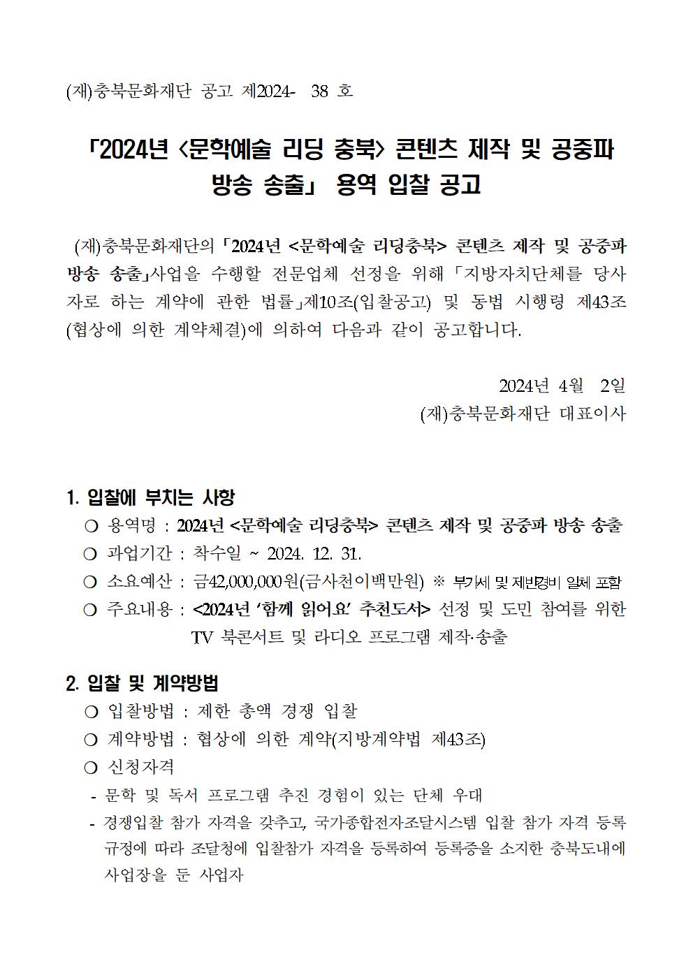 | 2024년 <문학예술리딩충북> 콘텐츠 제작 및 공중파 방송 송출 용역 입찰 공고 | |||||