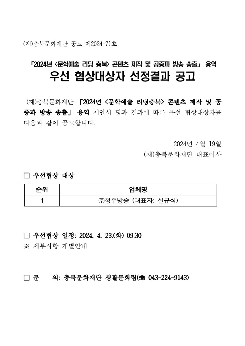 | 2024년 <문학예술리딩충북> 콘텐츠 제작 및 공중파 방송 송출 용역 우선 협상대상자 선정결과 공고 | |||||
