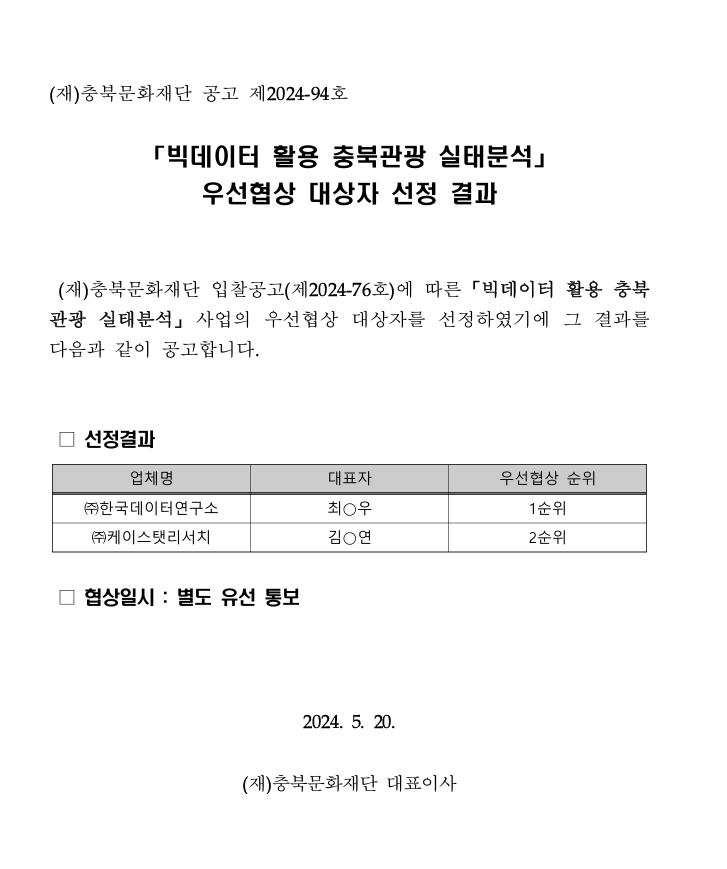 | 「빅데이터 활용 충북관광 실태분석」 우선협상대상자 선정결과 공고 | |||||