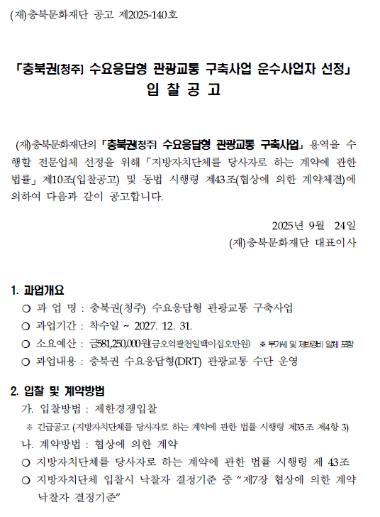 | 「충북권(청주) 수요응답형 관광교통 구축사업 운수사업자 선정」 입찰 공고 | |||||