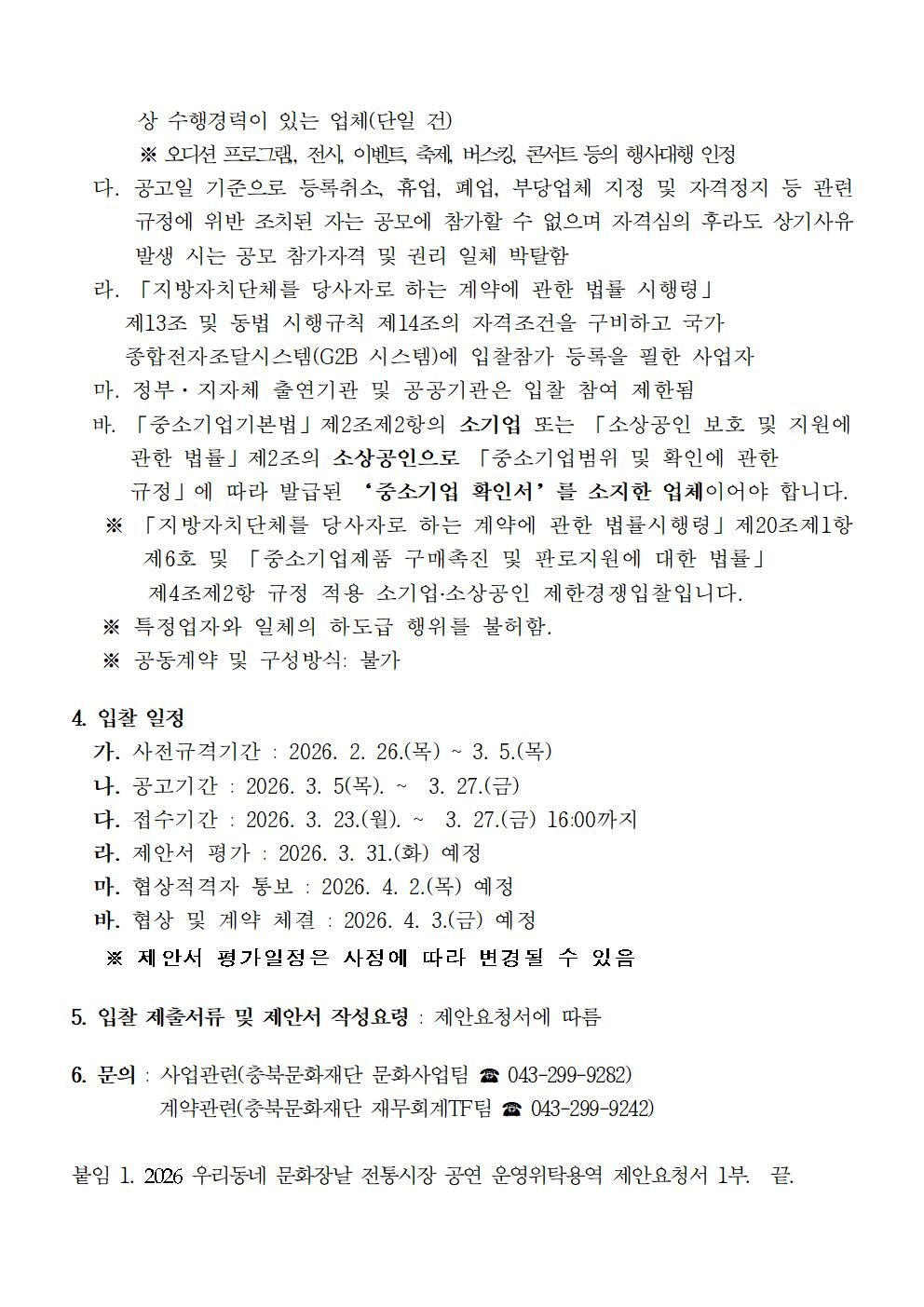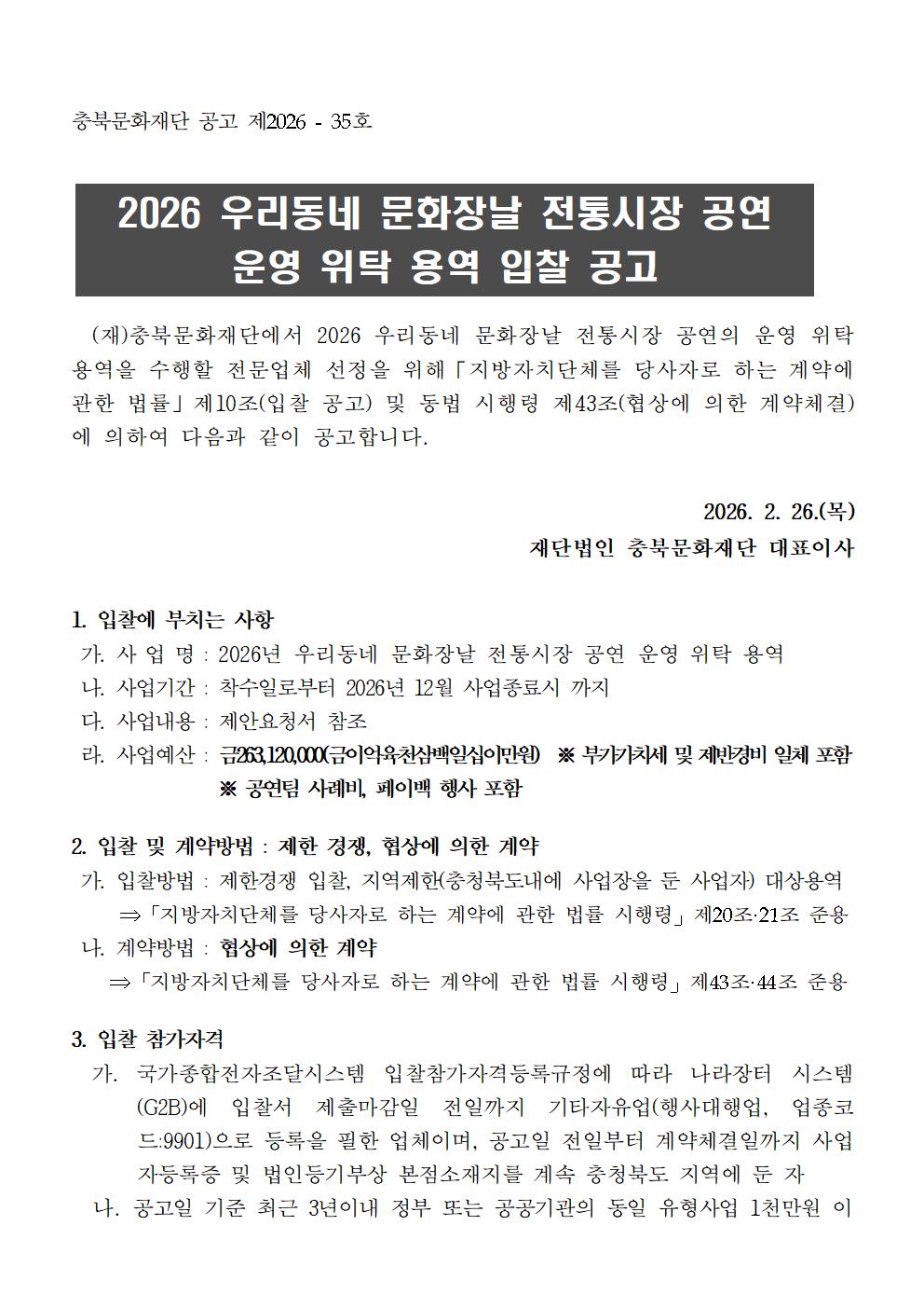 | 2026 우리동네 문화장날 전통시장 공연 운영 위탁 용역 입찰 공고 | |||||