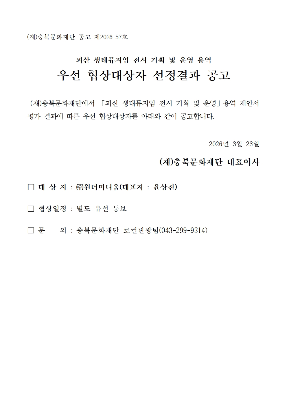 | 「괴산 생태뮤지엄 전시 기획 및 운영」 용역 우선 협상대상자 선정결과 공고 | |||||
