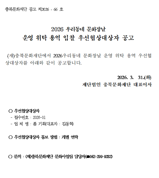 | 2026 우리동네 문화장날 운영 위탁 용역 입찰 우선협상대상자 공고 | |||||