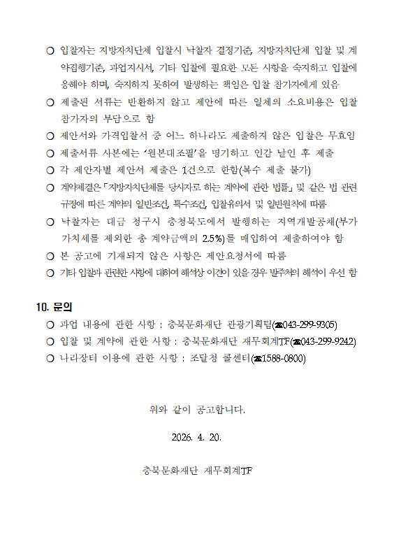 | 이전글 | 2026년 충북 문화예술지원사업 평가 용역 입찰 공고(수정) |
