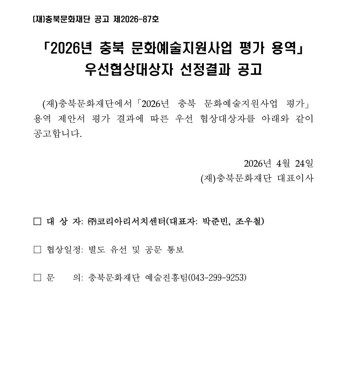 | 「2026년 충북 문화예술지원사엽 평가 용역」 우선협상대상자 선정결과 공고 | |||||