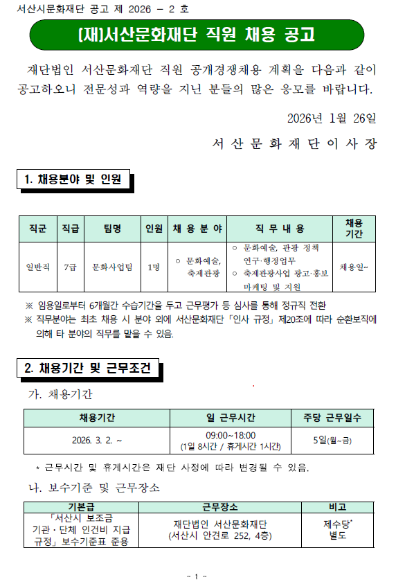 | [서산문화재단] 서산문화재단 직원 채용 공고 | |||||