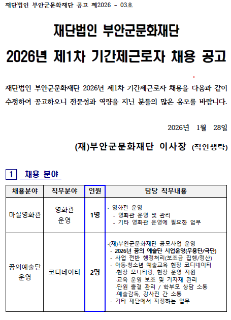 | [부안군문화재단] 2026년 제1차 기간제근로자 채용 공고 | |||||