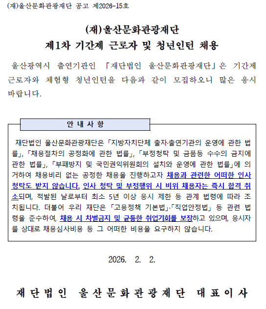 | [울산문화관광재단] 제1차 기간제 근로자 및 청년인턴 채용 | |||||