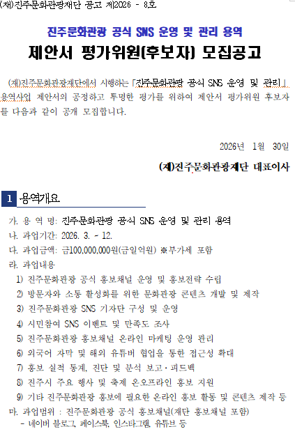 | [진주문화관광재단] SNS 운영 및 관리 용역 및 평가위원 모집 공고 | |||||