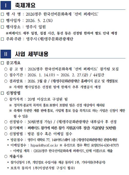 | [영주문화관광재단] 2026영주 한국선비문화축제 '선비 퍼레이드' 참가팀 모집 공고 | |||||