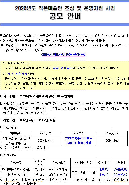 | [한국문화예술위원회] 2026년도 작은미술관 조성 및 운영지원 사업 공모 안내 | |||||