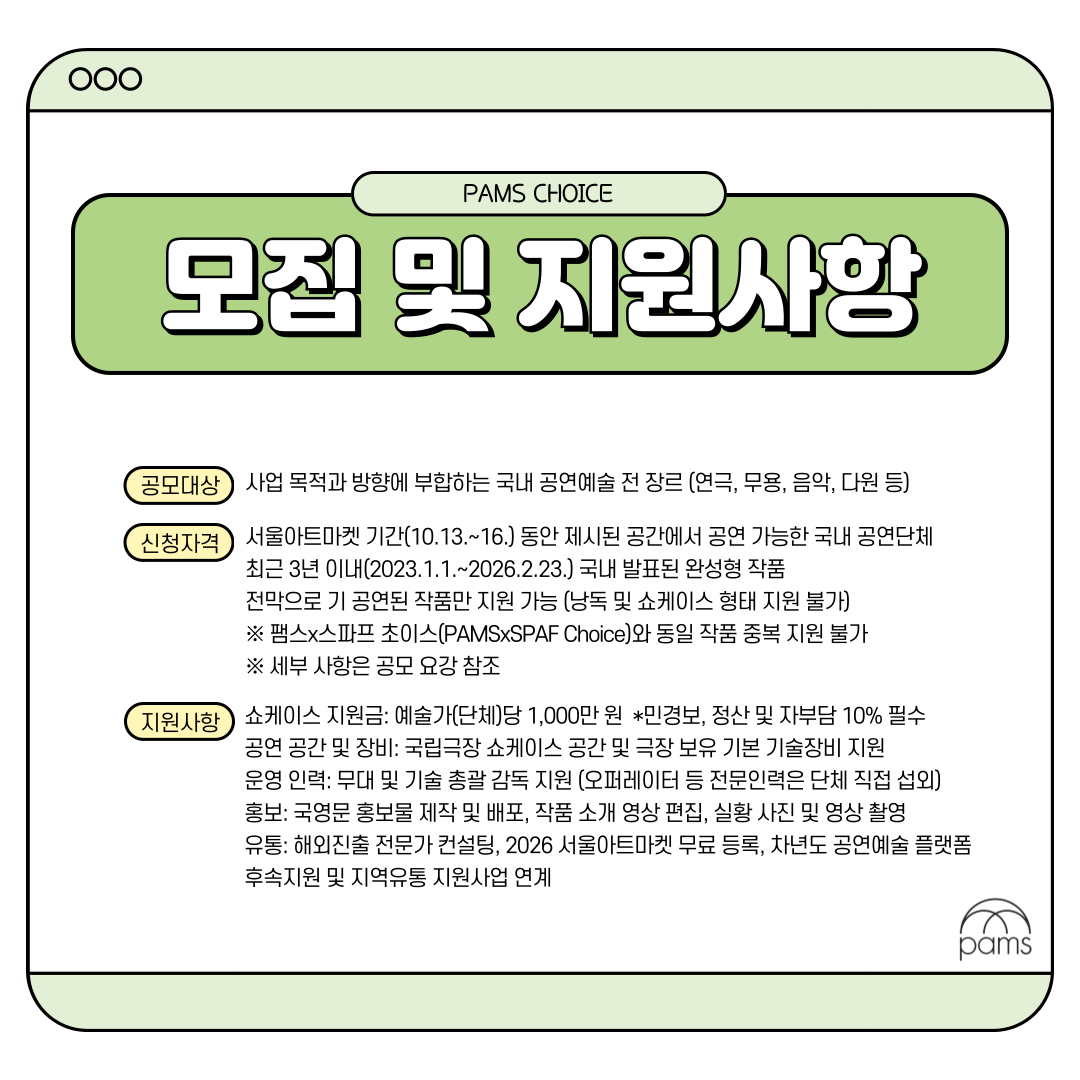 | [(재)예술경영지원센터] 2026 서울아트마켓 팸스초이스 전막공연 공모 | |||||