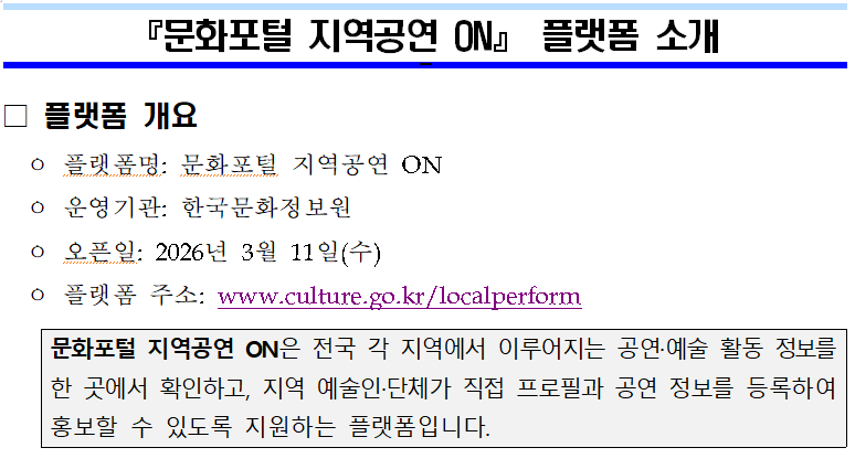 | [한국문화정보원] 「문화포털 지역공연 ON」 플랫폼 오픈 안내 | |||||