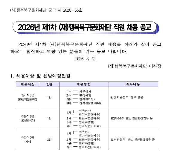 | [(재)행복북구문화재단] 2026년 제1차 (재)행복북구문화재단 직원 채용 | |||||