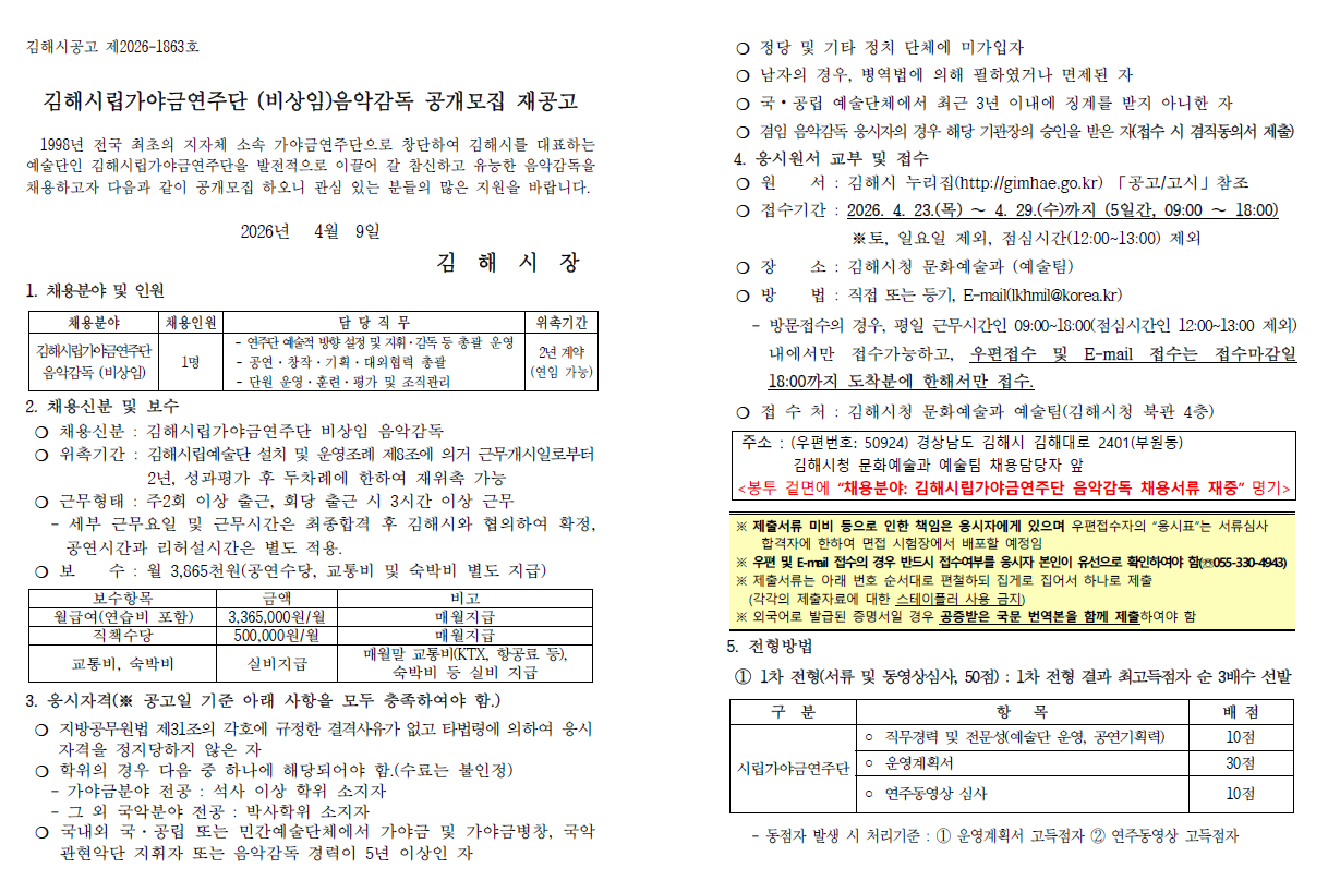 | [김해시] 김해시립가야금연주단 (비상임)음악감독 공개모집 재공고 | |||||