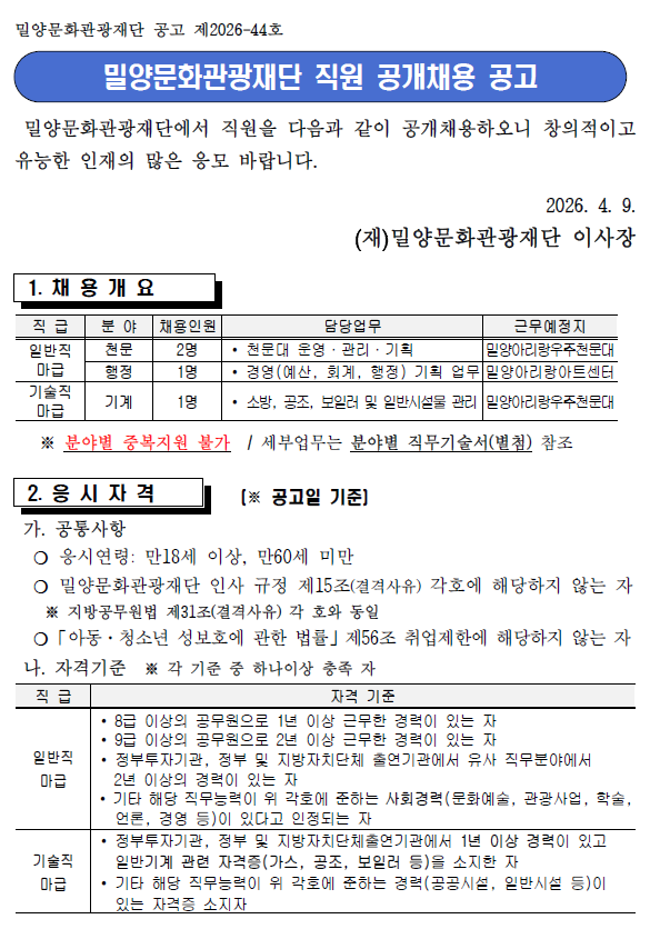 | [(재)밀양문화관광재단] 2026년 직원 공개채용 공고 | |||||