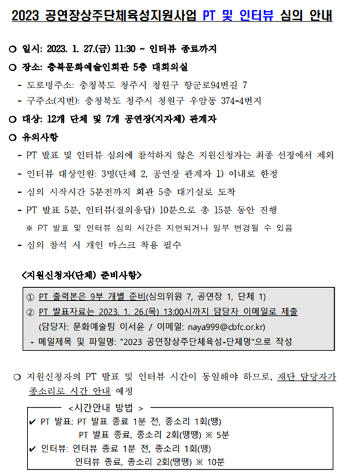 | 2023 공연장상주단체육성지원사업 PT 및 인터뷰 심의 안내 | |||||