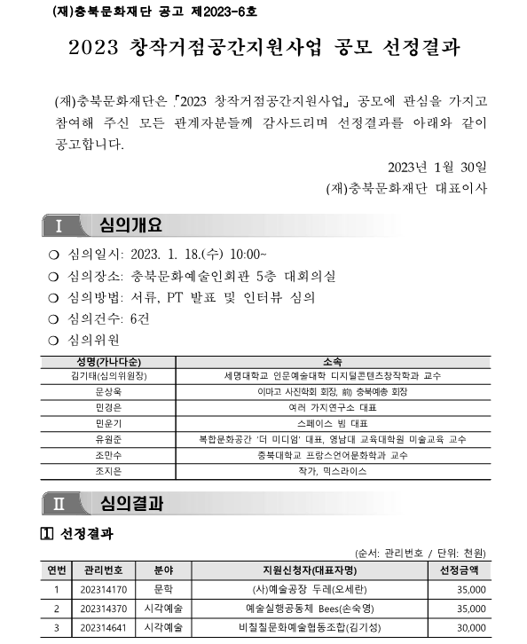 | 2023 창작거점공간지원사업 공모 선정결과 | |||||