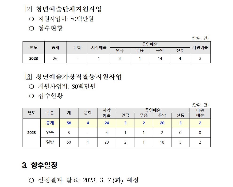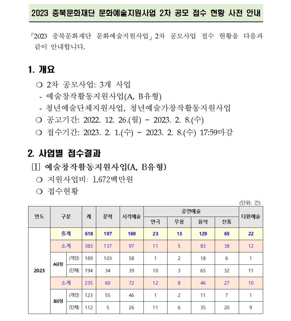 | 2023년 충북문화재단 문화예술지원사업 2차 공모 접수 현황 사전 안내 | |||||