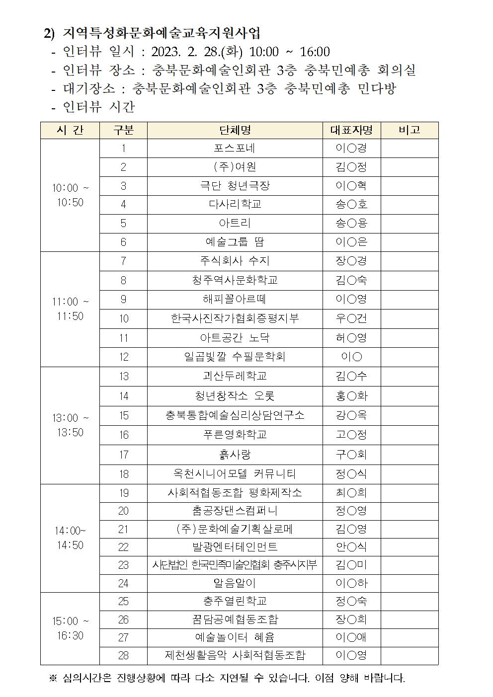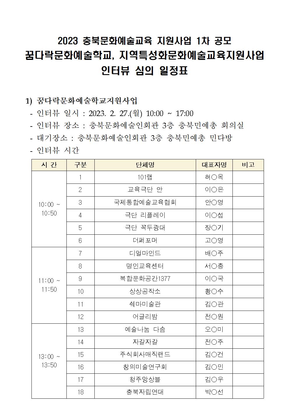 | 2023년 충북문화예술교육 지원사업 1차 공모(꿈다락, 지역특성화) 인터뷰심의 안내 | |||||