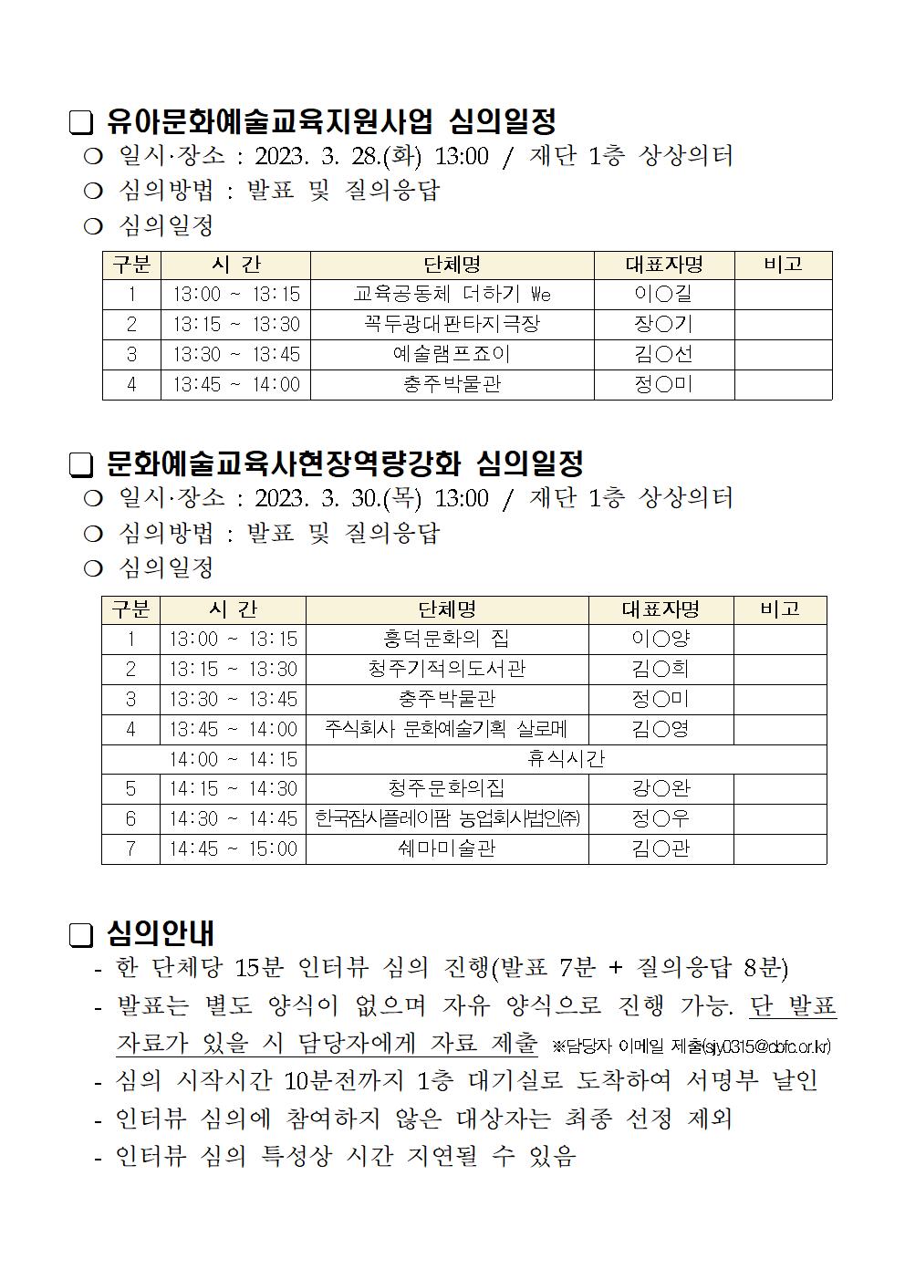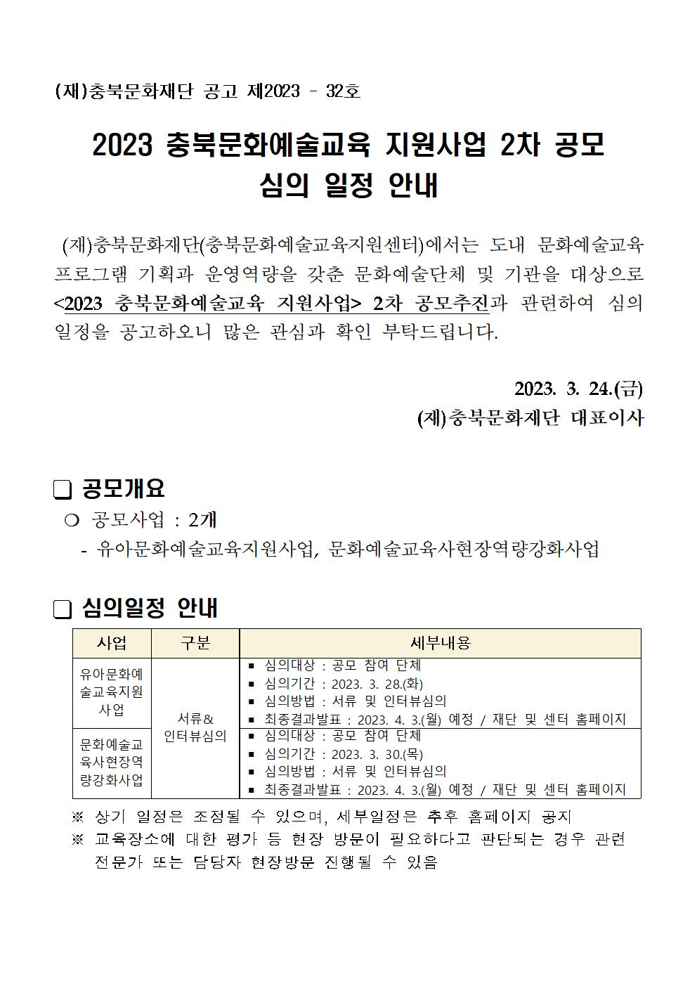 | 2023 충북문화예술교육 지원사업 2차 공모 심의일정 안내 | |||||