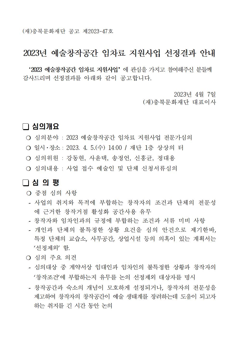 | 2023 예술창작공간 임차료 지원사업 선정결과 안내 | |||||