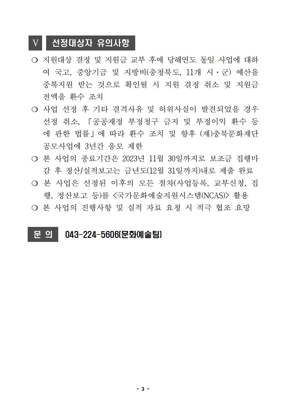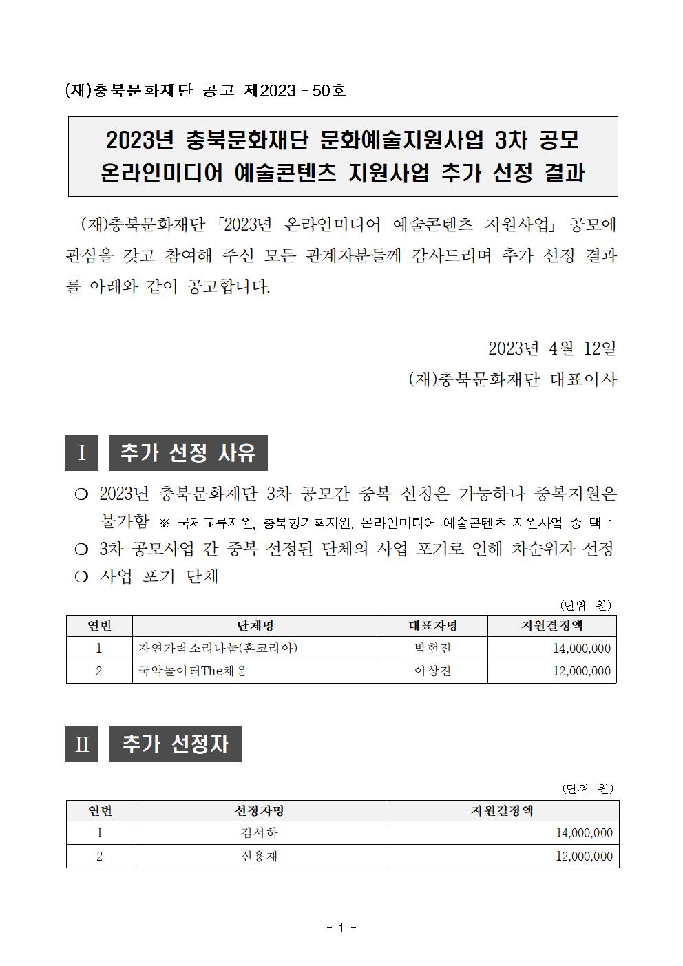 | 2023년 충북문화재단 3차 공모 온라인미디어 예술콘텐츠 지원사업 추가 선정 결과 | |||||