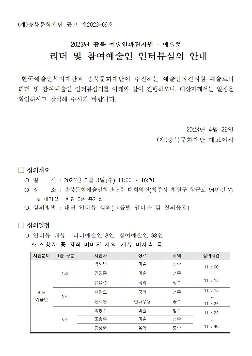 | 2023 충북 예술인파견지원-예술로 리더 및 참여 예술인 인터뷰심의 안내 | |||||