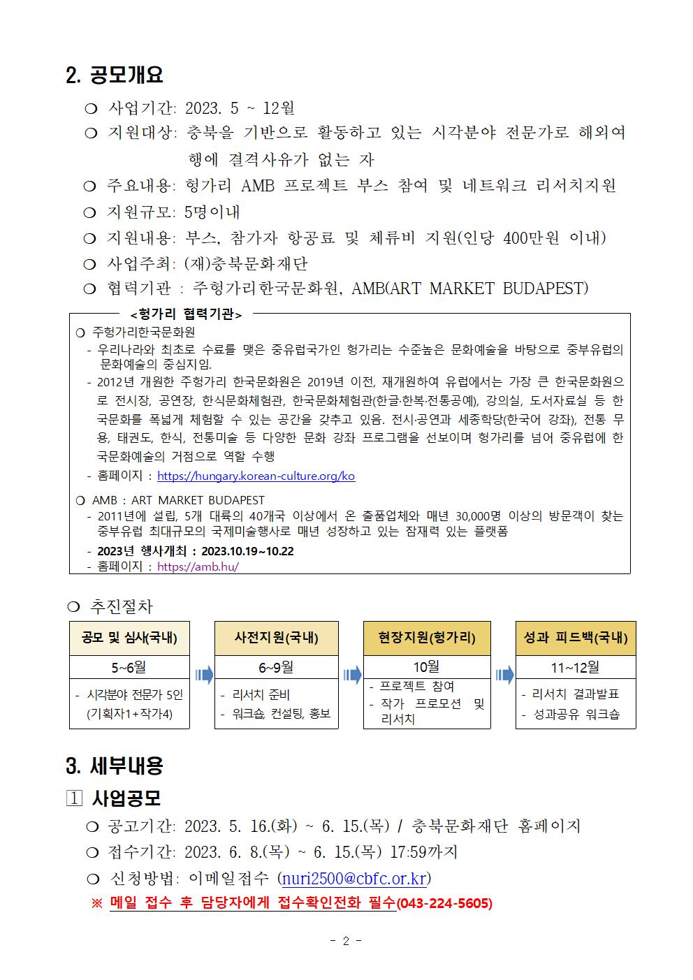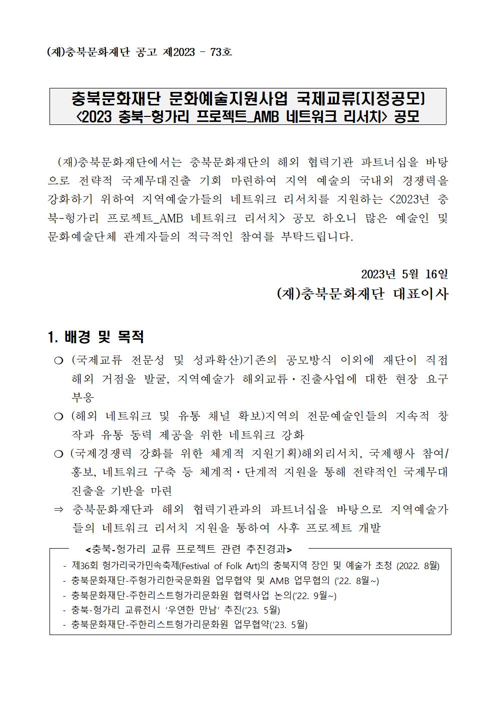 | 2023년 충북문화재단 문화예술지원사업 국제교류(지정공모형) <2023 충북-헝가리 프로젝트_AMB 네트워크 리서치> 공모 | |||||