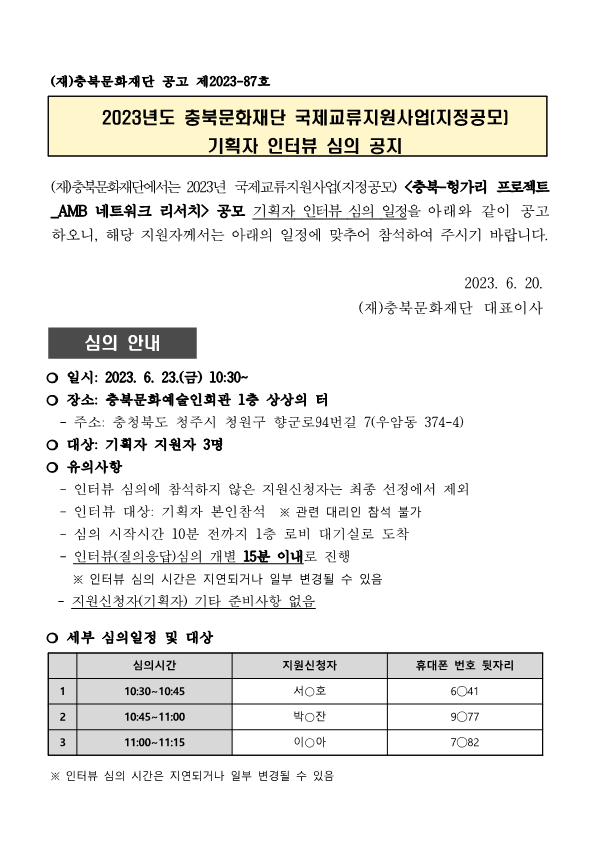 | 2023년도 충북문화재단 국제교류지원사업(지정공모) 기획자 인터뷰 심의 공지 | |||||