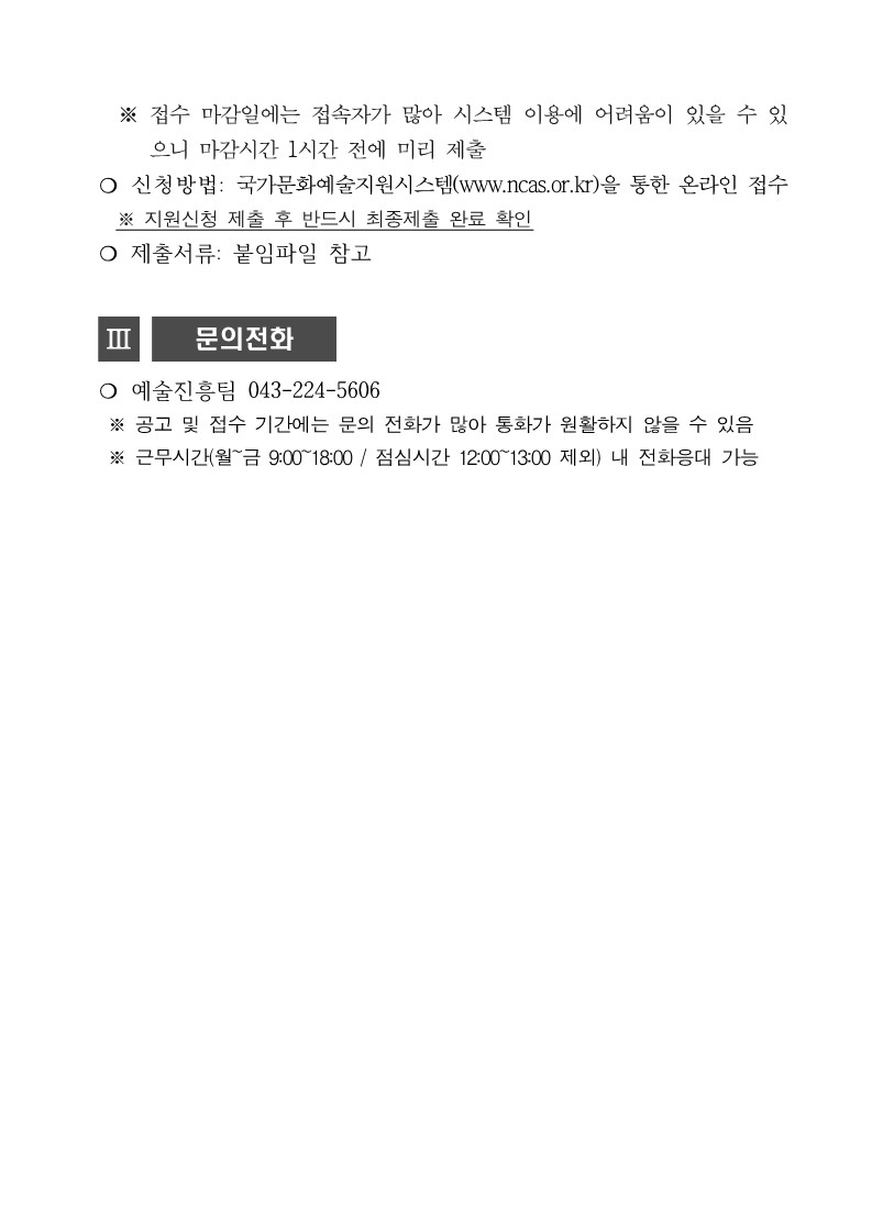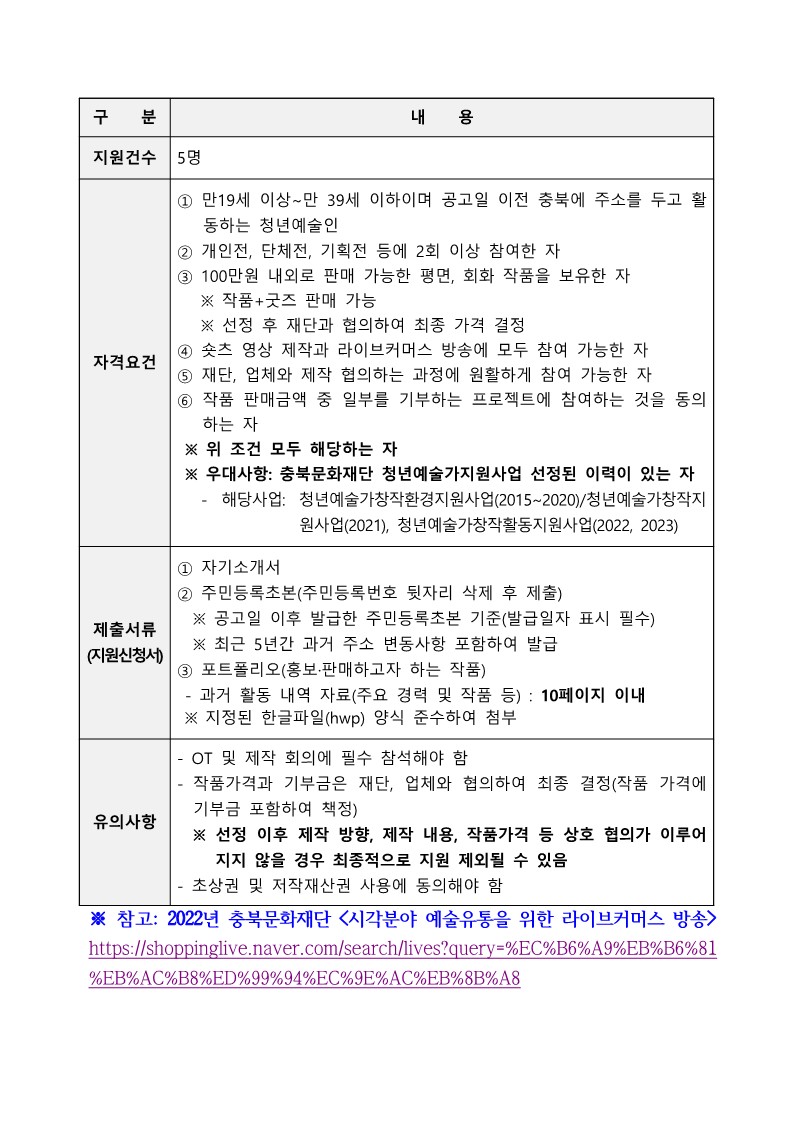 | 2023년 충북문화재단 <충북 시각예술인 홍보 유통 콘텐츠 제작 사업> 청년예술인 공모(연장) | |||||