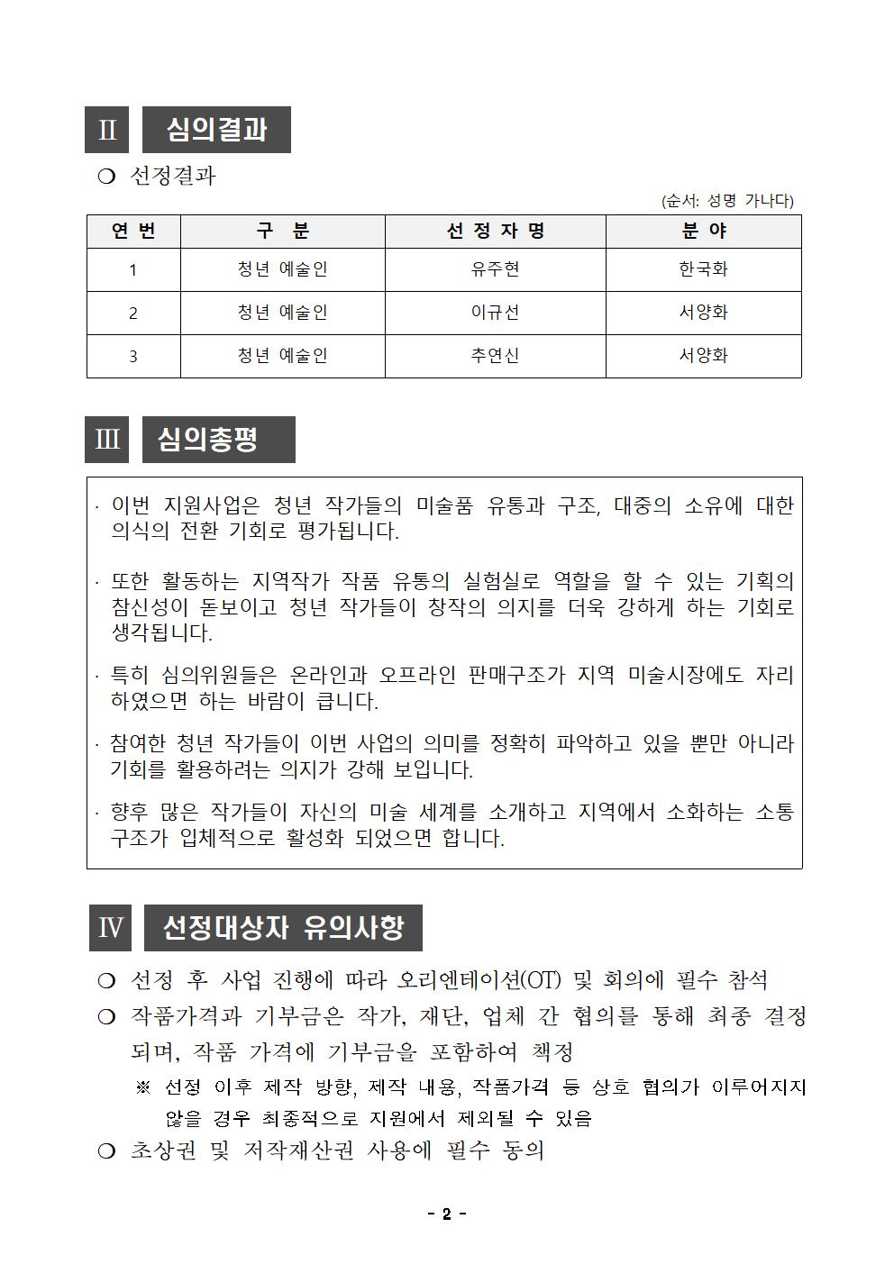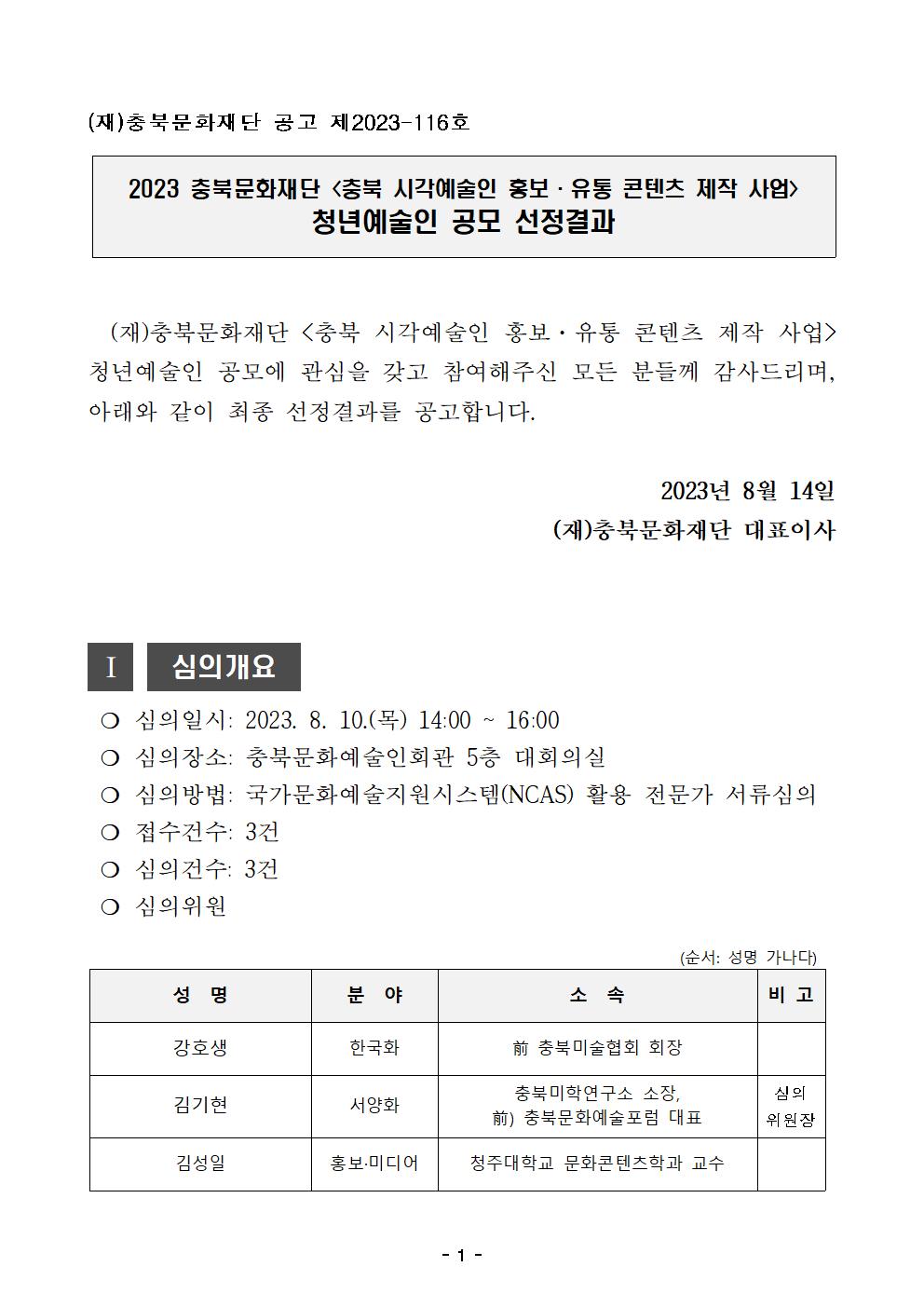 | 2023년 충북문화재단<충북 시각예술인 홍보·유통 콘텐츠 제작 사업> 청년 예술인 모집 공모 선정결과 | |||||