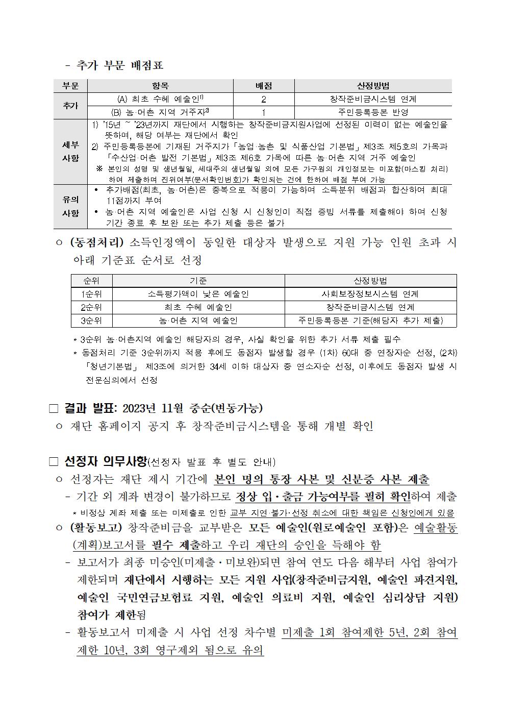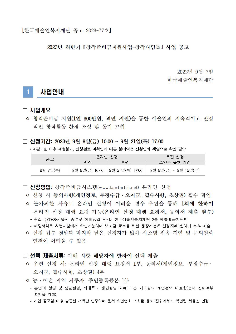 | 2023 하반기 창작준비금지원사업-창작디딤돌 사업안내(한국예술인복지재단) | |||||