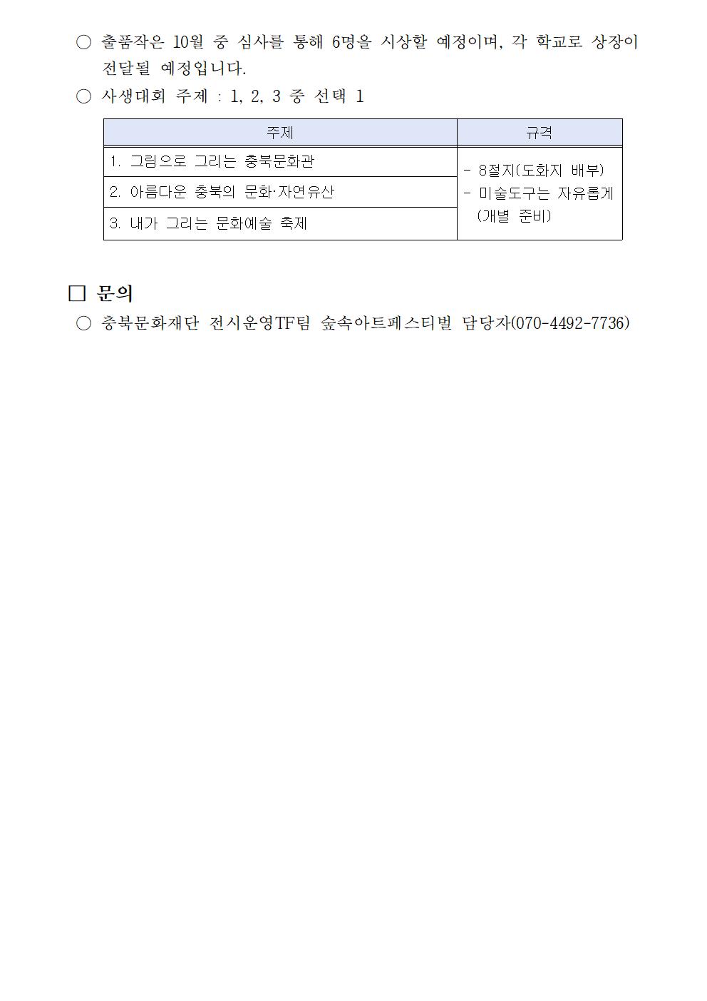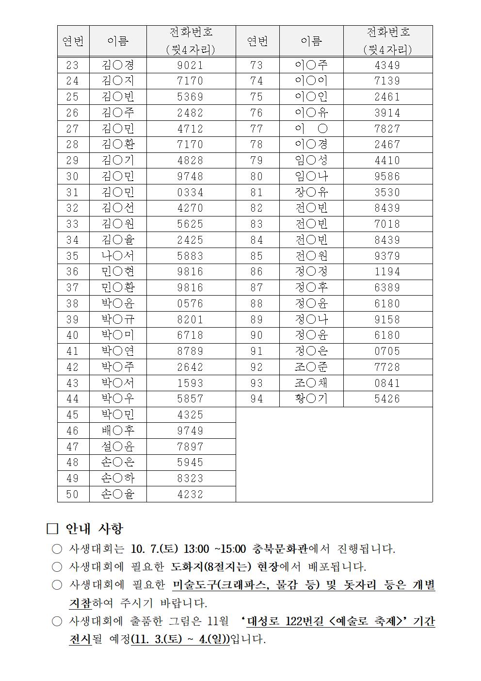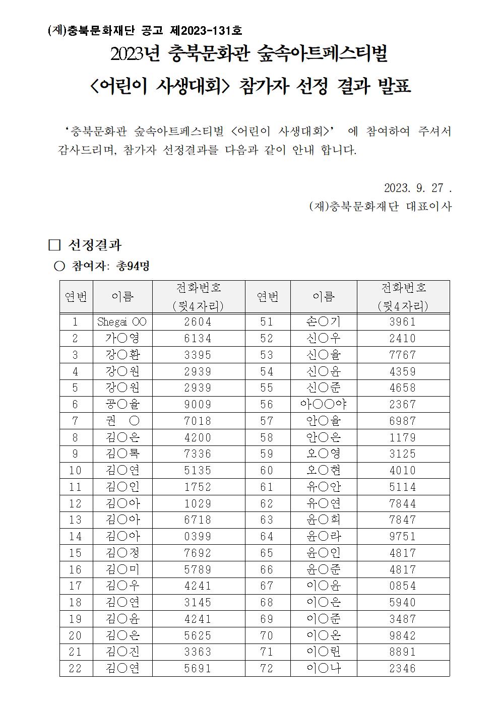 | 2023 충북문화관 숲속아트페스티벌 <어린이 사생대회> 참여자 선정 결과 발표 | |||||