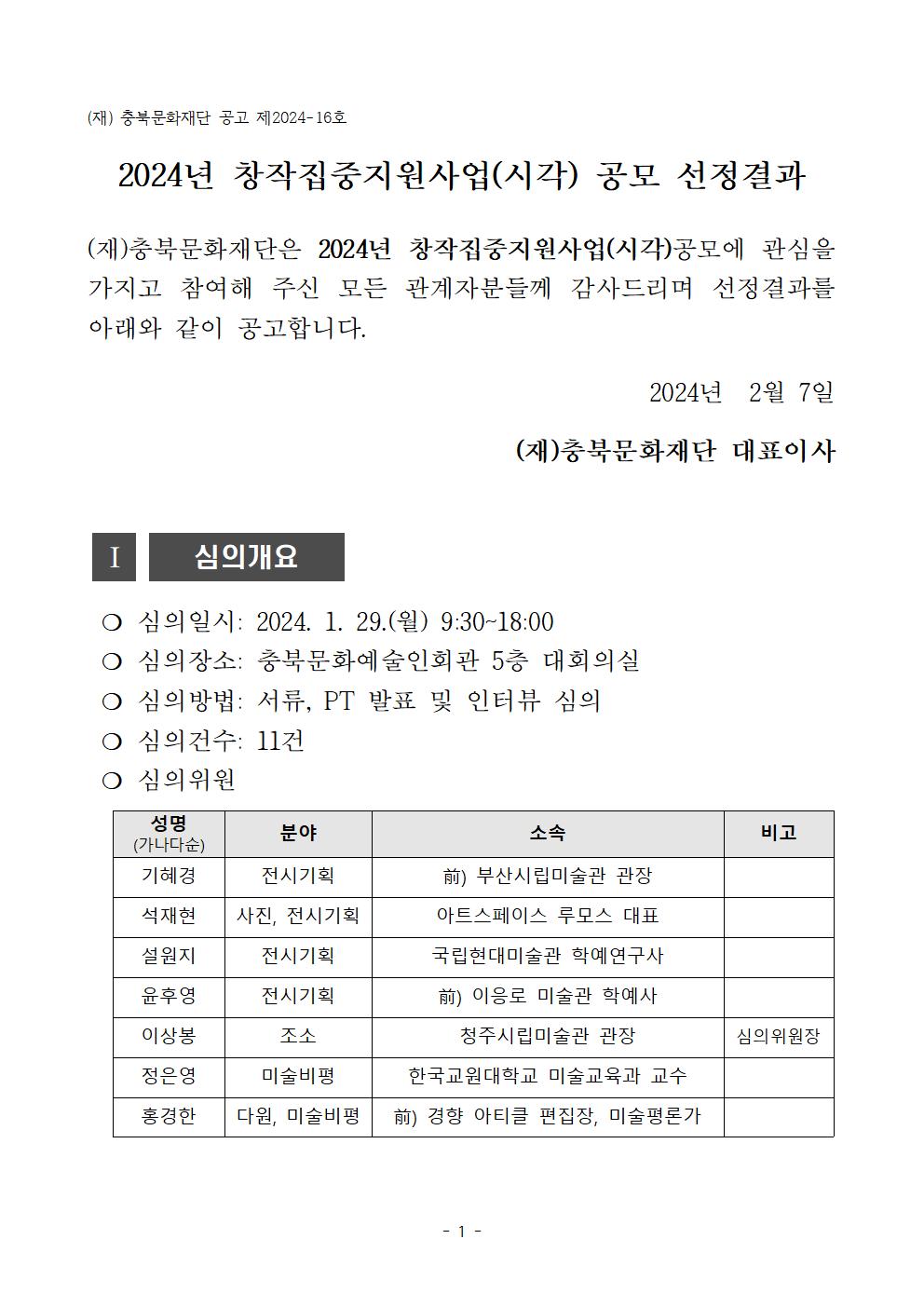 | 2024년 창작집중지원사업(시각) 공모 선정결과 | |||||