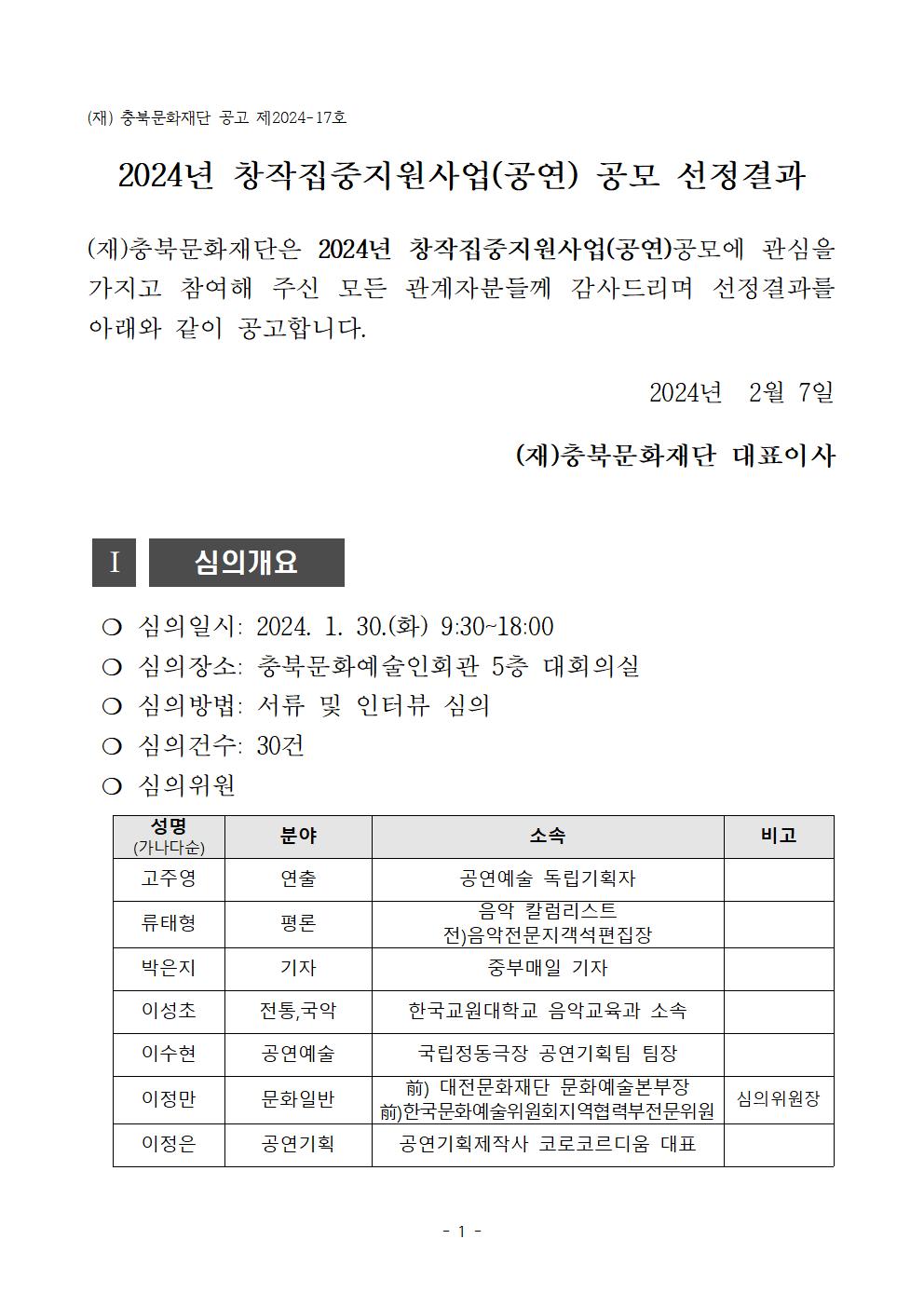 | 2024년 창작집중지원사업(공연) 공모 선정결과 | |||||