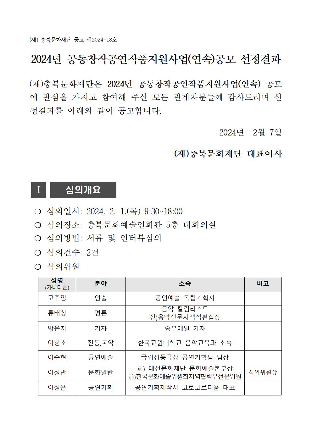 | 2024년 공동창작공연작품지원사업(연속)공모 선정결과 | |||||