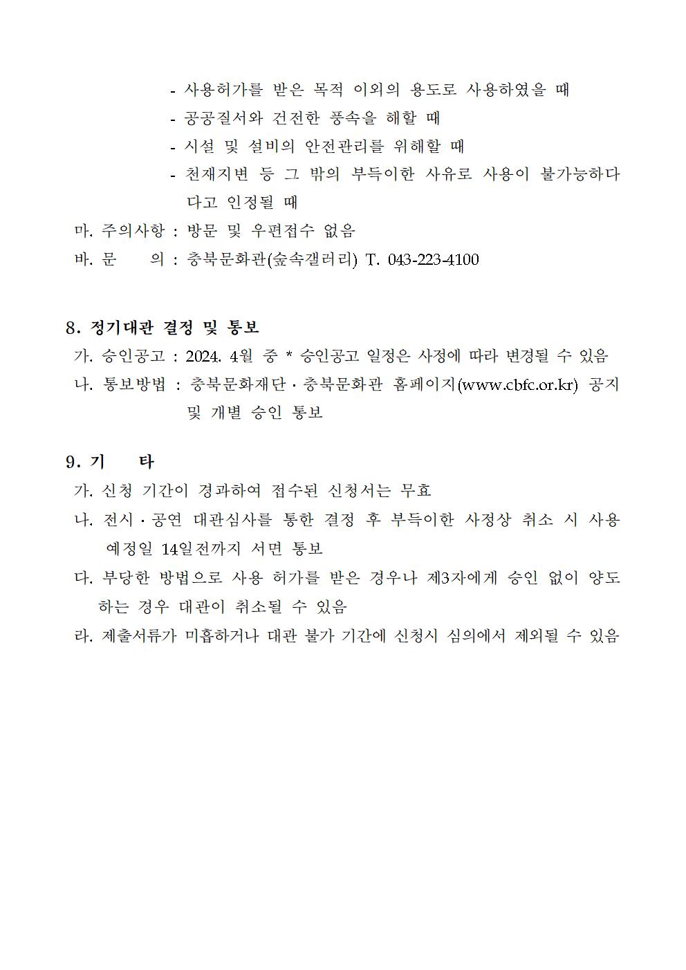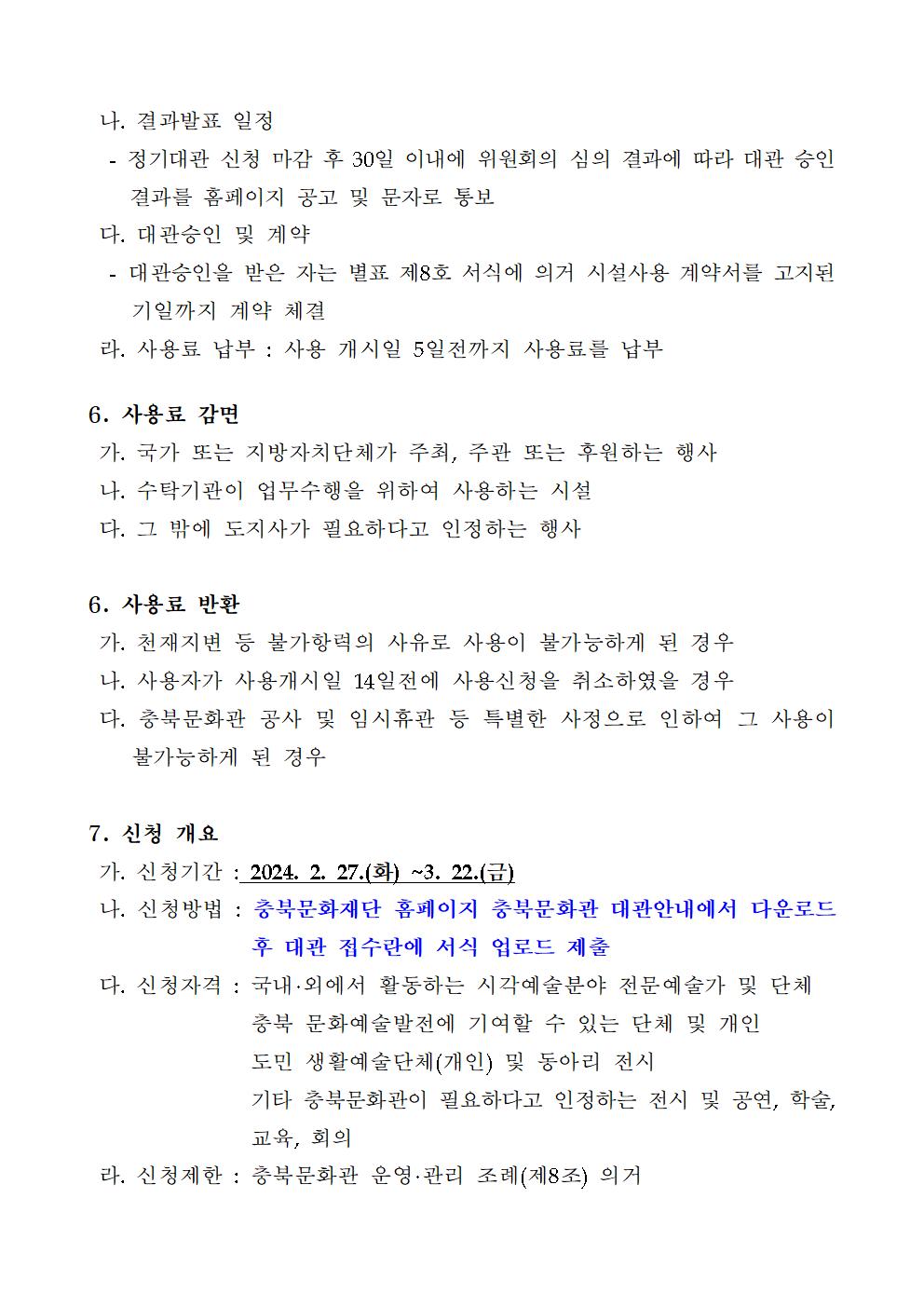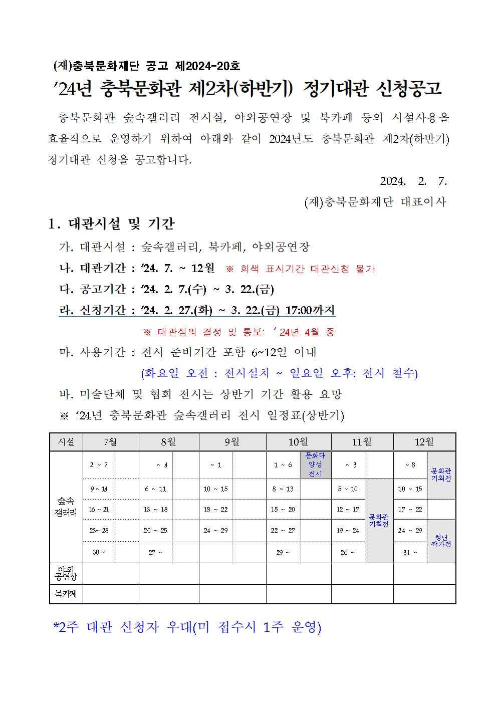 | 2024년 충북문화관 제2차(하반기) 정기대관 신청공고 | |||||