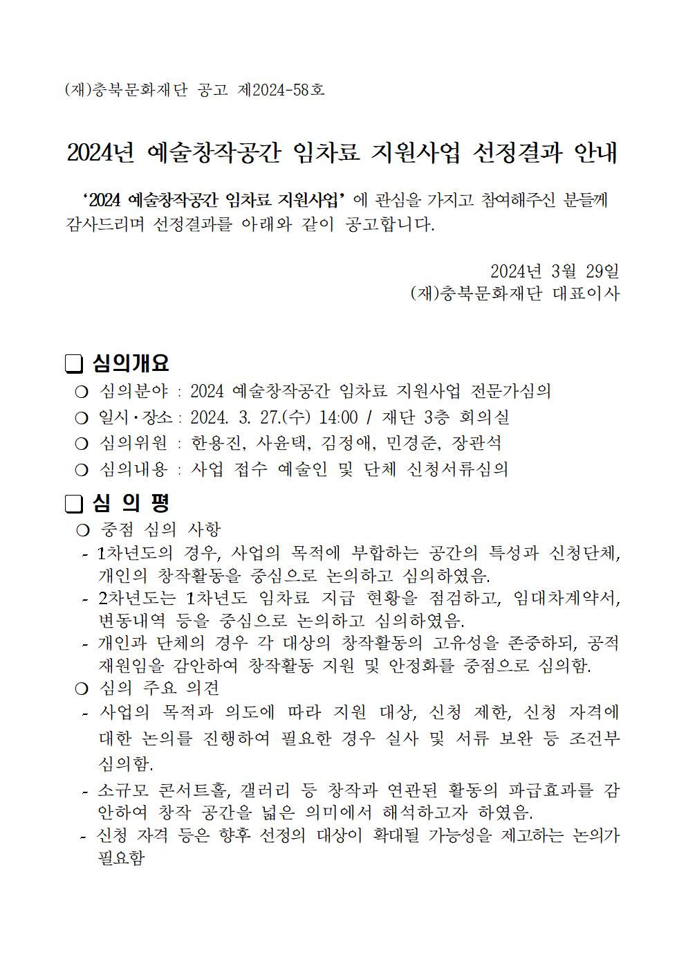 | 2024 예술창작공간임차료 지원사업 선정결과 발표 | |||||