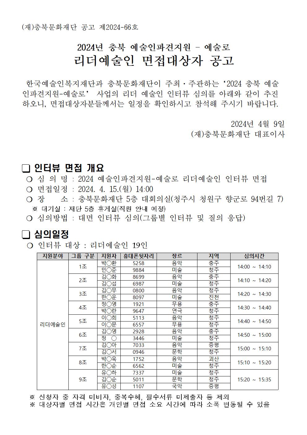 | 2024 충북 예술인파견지원-예술로 리더예술인 면접대상자 공고 | |||||