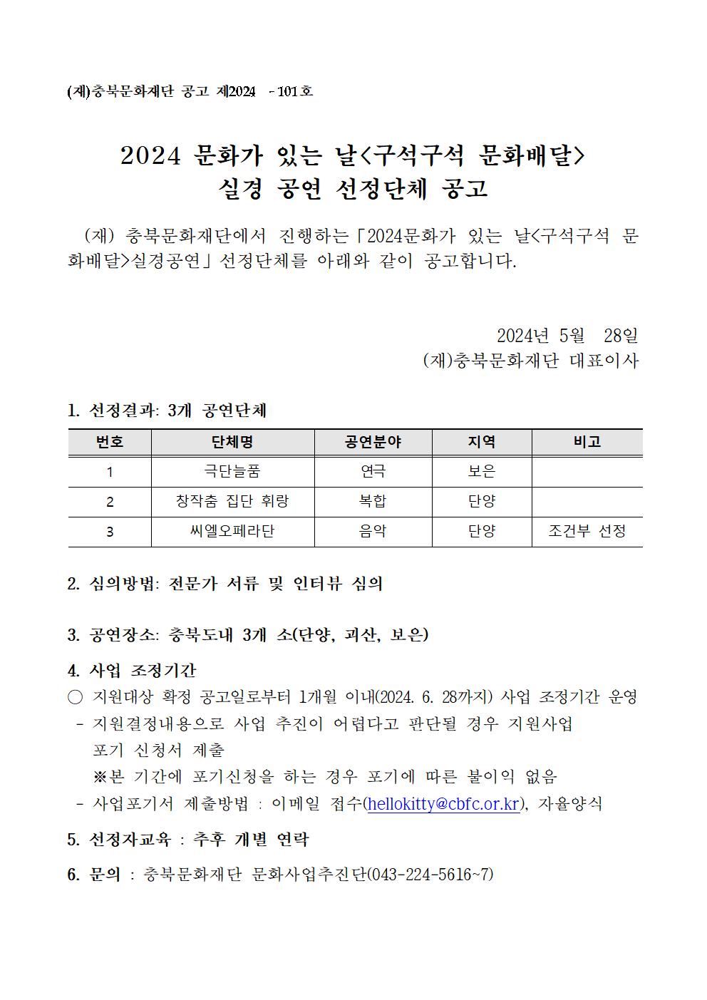 | 2024문화가 있는 날(구석구석 문화배달) 실경공연 단체 선정결과 공고 | |||||