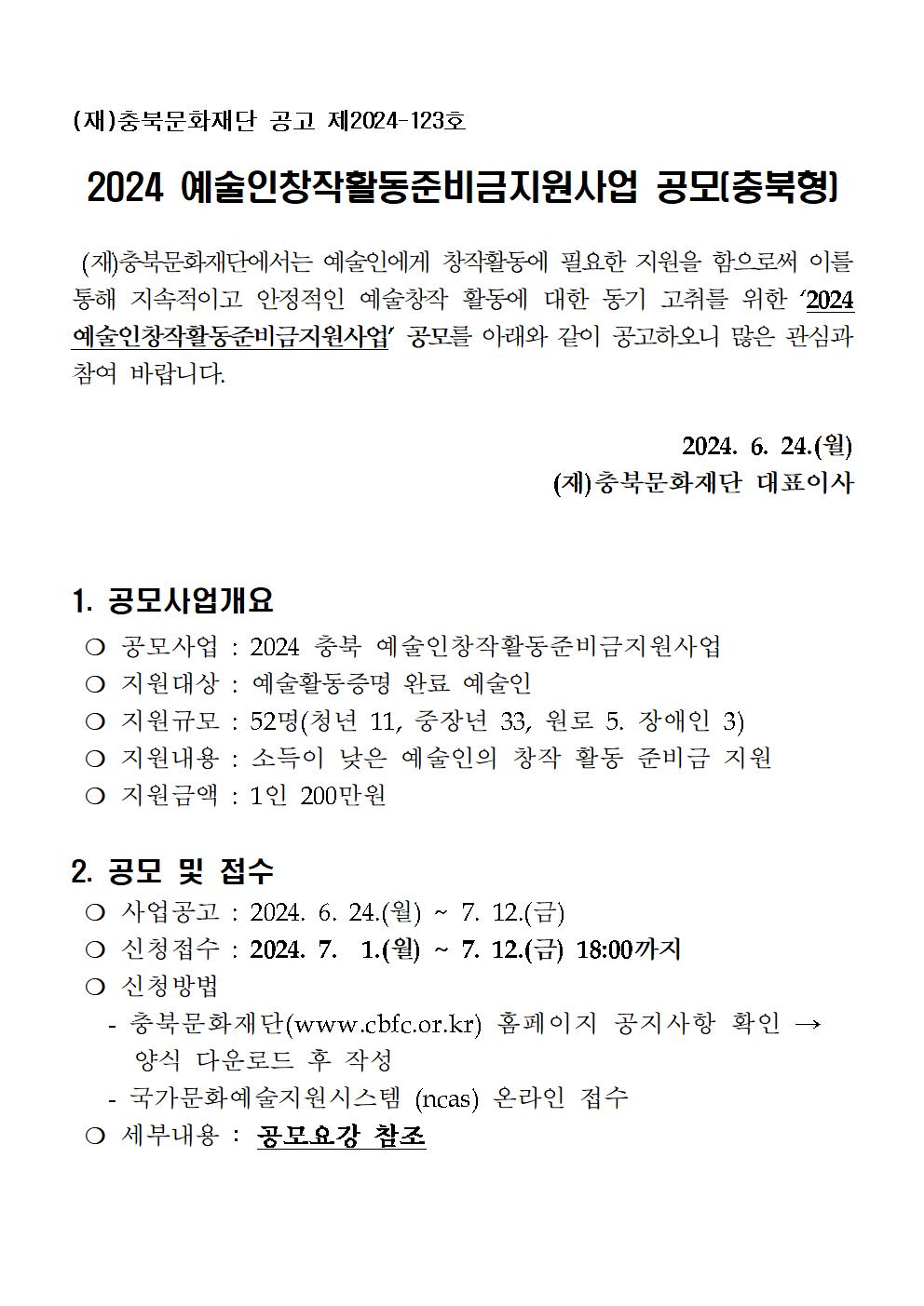 | 2024 (충북형)예술인창작활동준비금지원사업 공모 | |||||