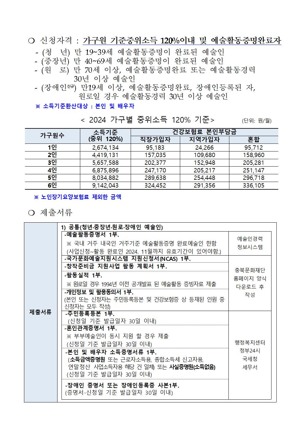 수정사항 : 소득기준 환산대상 본인 및 배우자 (부부예술인이 지원 할 경우) → 소득기준 환산대상에서 괄호부분만 삭제하였습니다.