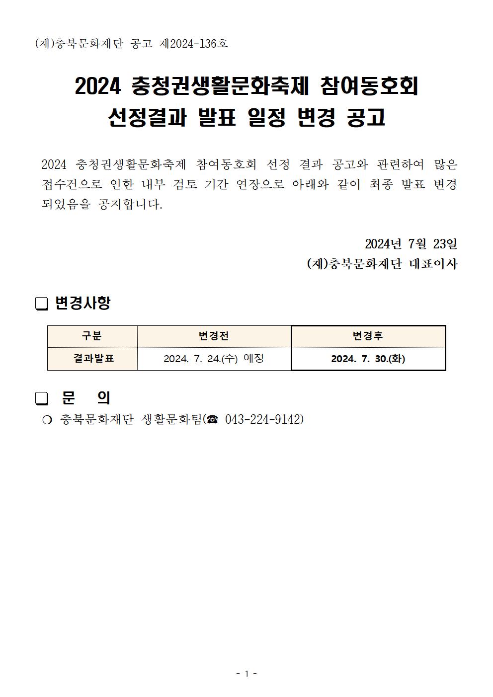 | 2024 충청권생활문화축제 참여동호회 선정 결과 발표 일정 변경 안내 | |||||