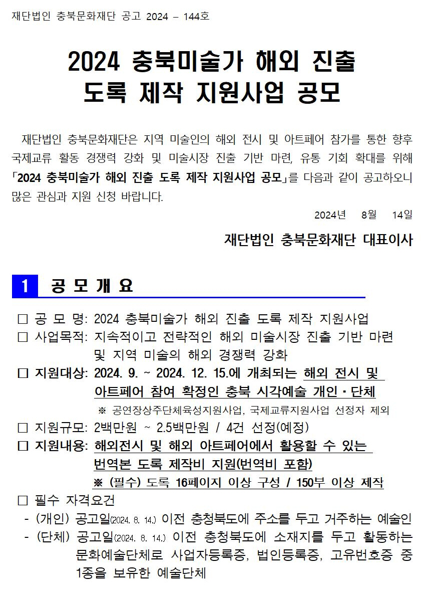 | 2024 충북미술가 해외 진출 도록 제작 지원사업 공모 | |||||