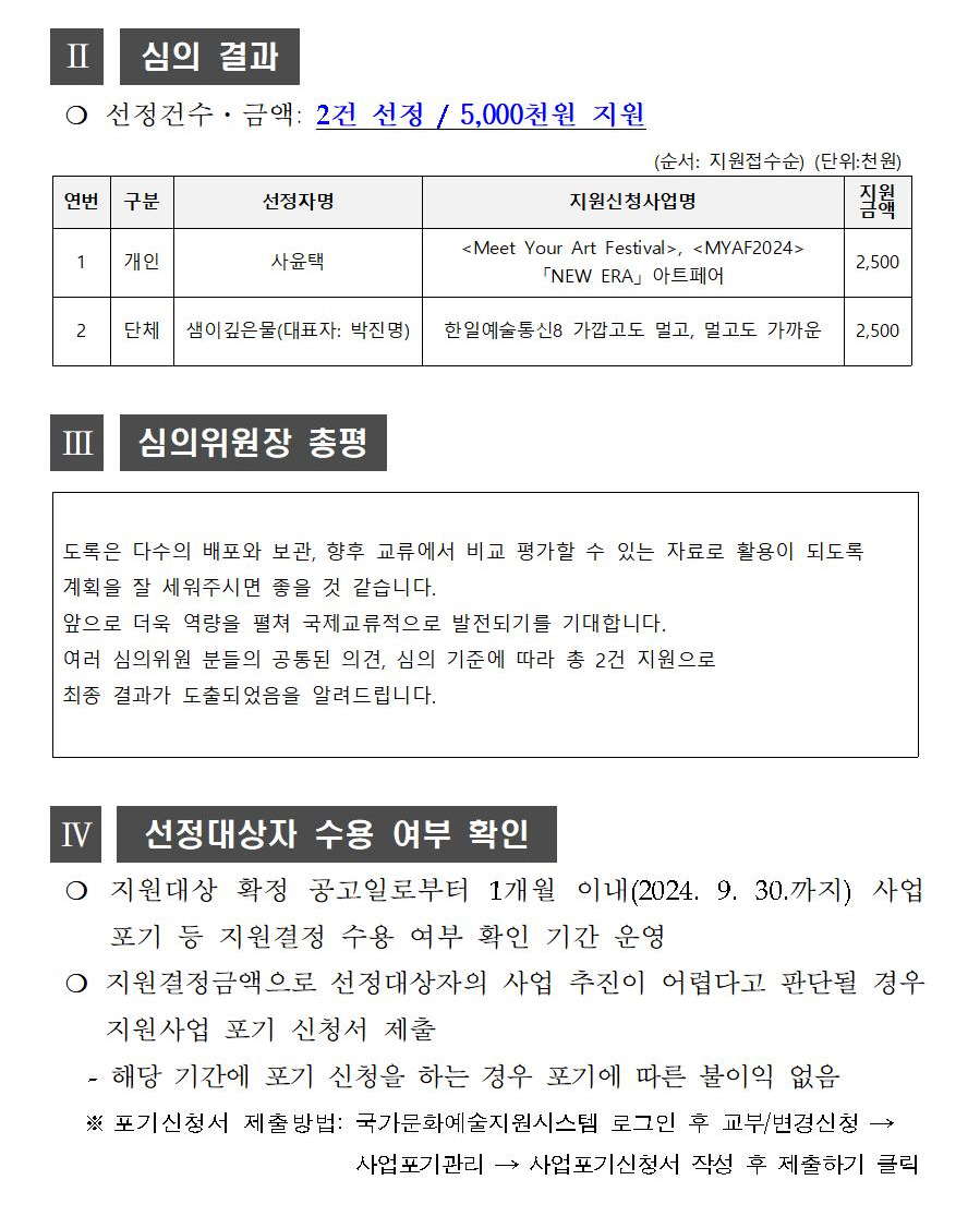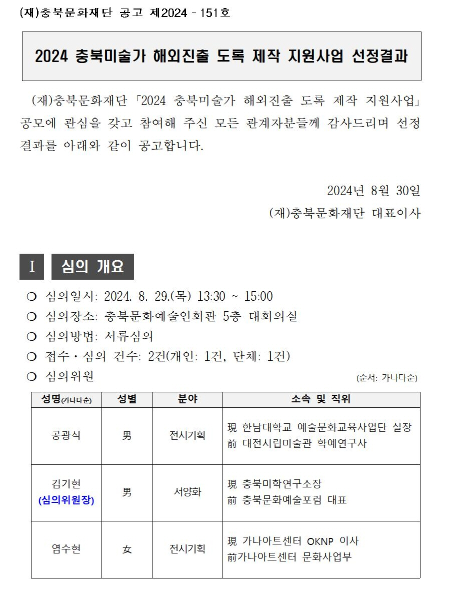 | 2024 충북미술가 해외 진출 도록 제작 지원사업 선정결과 | |||||