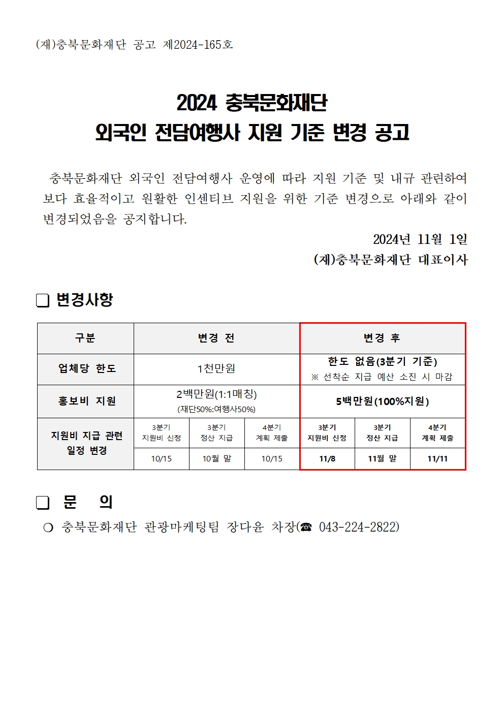 | 2024 충북 외국인 관광객 유치 전담여행사 지원 기준 변경 공고 | |||||