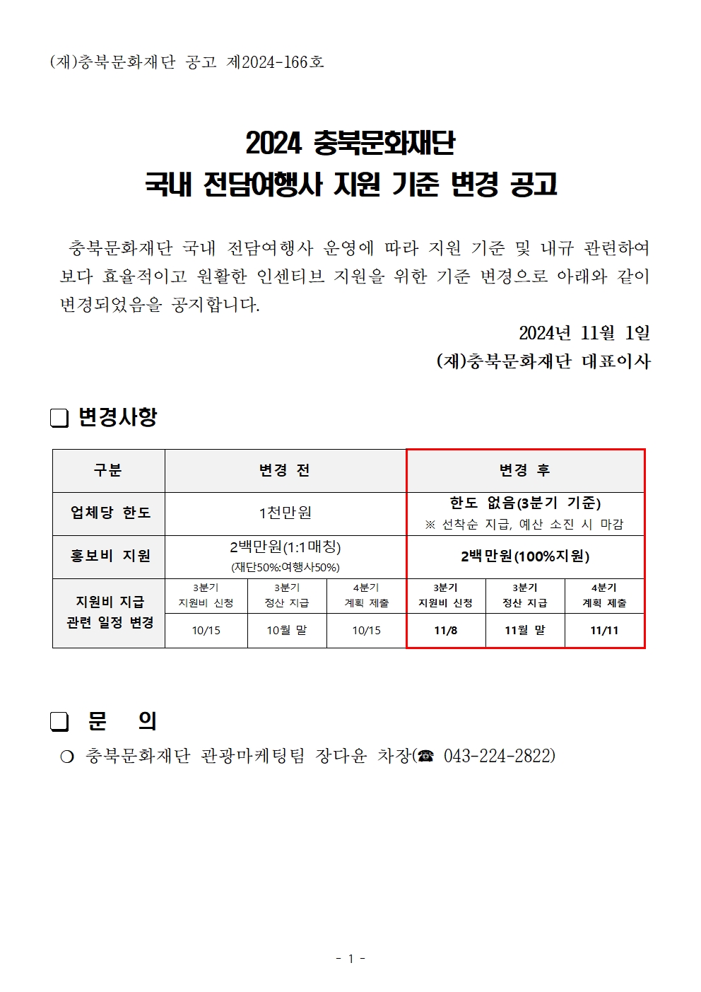 | 2024 충북 국내 관광객 유치 전담여행사 지원 기준 변경 공고 | |||||
