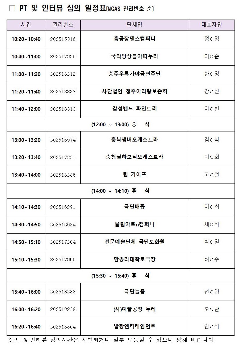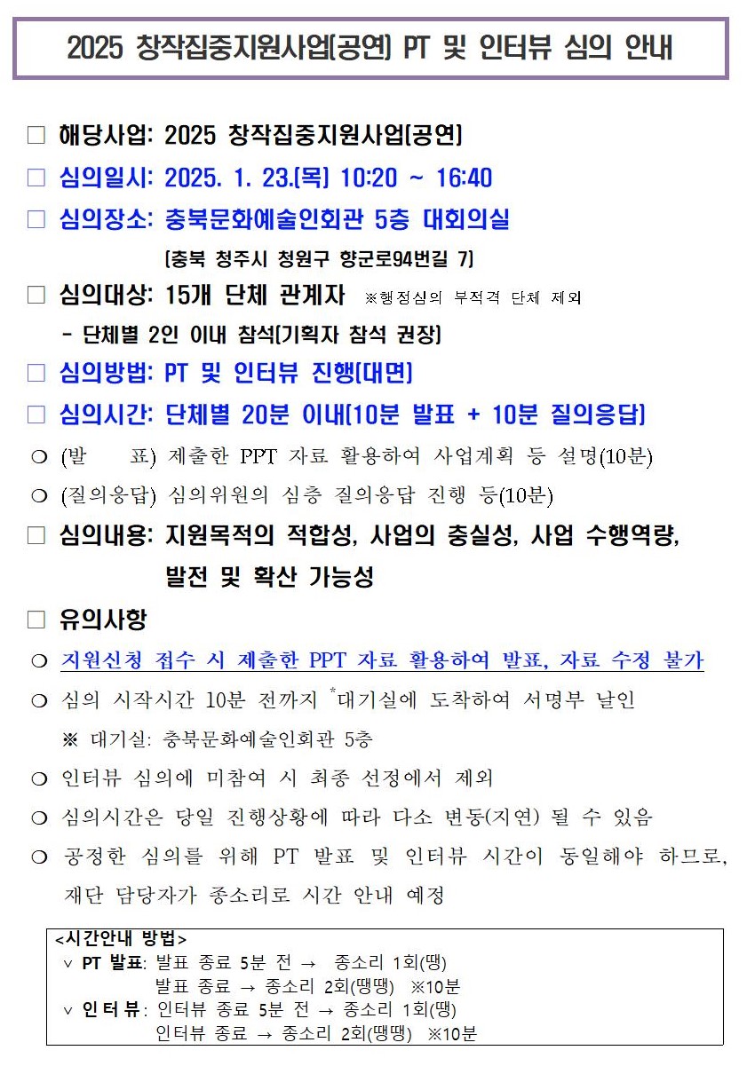 | 2025 창작집중지원사업(공연) PT 및 인터뷰 심의 안내 | |||||